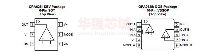 OPAx625 系列采用 6 引脚小外形尺寸晶体管 (SOT) 封装和 10 引脚超薄小外形尺寸 (VSSOP) 封装,额定工作温度范围为 –40°C 至 +125℃。