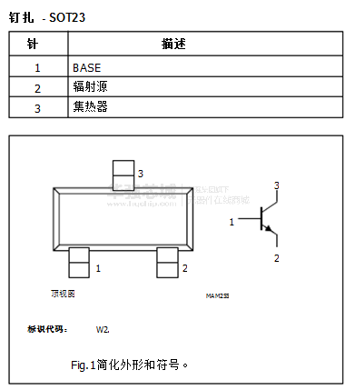 在表面硅NPN晶体管装入3针SOT323封装。晶体管主要用于宽带中的模拟RF前端应用在GHz范围和数字蜂窝电话,无绳电话,雷达检测器,寻呼机和卫星电视调谐器。