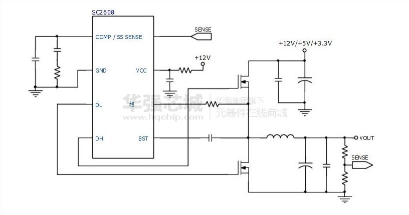 SC2608的功能包括温度补偿电压年纪参考,三角波振荡器,限流比较parator ,和一个外部补偿的误差放大器。电流限制通过感测上的电压降来实现在底部MOSFET řDS ( ON).在SC2608工作在200kHz的固定频率提供效率之间的最佳折衷,外部组件的尺寸和成本。SC2608有一个热保护电路,它是如果结点温度超过150激活
