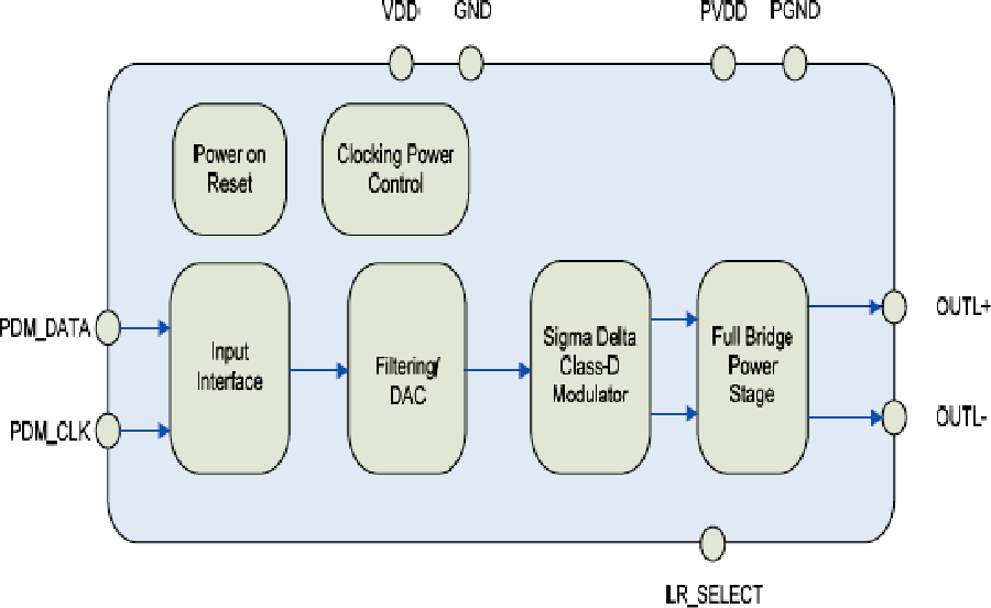 SSM2517是一款PDM数字输入D级功率放大器。比现有的DAC加D级解决方案的性能更加出色。该器件是功率敏感应用的理想选择。在功率敏感应用中系统噪声能够破坏发送至放大器的小模拟信号,例如移动电话和便携式多媒体播放器。DAC加模拟Σ-Δ架构处理数字音频源时实际功耗极低,同时又具备出色的音频性能。通过采用SSM2517,音频能够以数字的方式发送至音频放大器从而有效地降低了噪声源的影响,例如GSM干扰或发送音频上的其他数字信号。采用5.0 V电源供电时,它能够提供2.5 W连续输出功率,驱动4 Ω负载,总谐波失真加噪声(THD + N)小于1%。SSM2517采用高效率、低噪声调制方案,无需外部LC输出滤波器。闭环3级调制器设计保留了纯数字放大器的优势,同时又具有极佳的PSRR和音频性能。该调制能够在低功耗情况下继续提供高效率,且PDM输出的SNR为96dB。与其它D类架构相比,采用扩频脉冲密度调制可提供更低的电磁辐射。SSM2517具有5态增益和采样频率选择引脚,可以选择两种不同的增益设置,针对3.6V和5V工作进行了优化。该引脚还控制了内部数字滤波和计时,可设置为64fs或128fs的输入采样速率,支持3MHz和6MHz的PDM时钟速率。