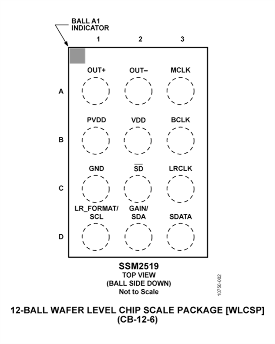 SSM2519的额定温度范围为−40°C至+85°C工业温度范围。它内置热关断和输出短路保护功能,采用12引脚、1.4 mm x 1.7 mm晶圆级芯片规模封装(WLCSP)。