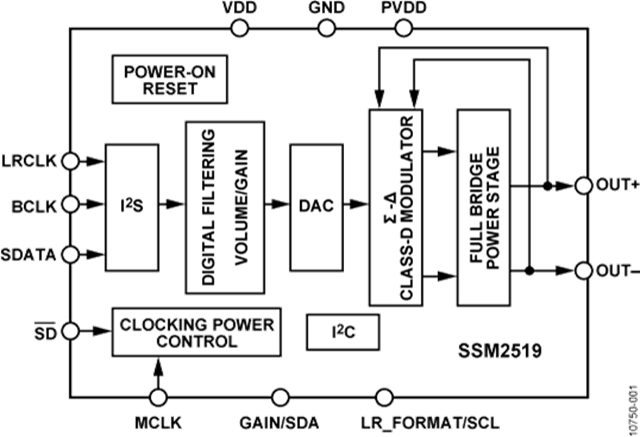 输入通过可编程串行音频接口提供,能够接受包括I2S、左对齐(LJ)、右对齐(RJ)、TDM和PCM在内的所有常见音频格式。SSM2519可以在具有或不具有I2C等控制接口的情况下工作,而此类器件通常需要该控制接口。不使用I2C控制时,可通过数个控制引脚来选择工作方式。SSM2519可以接受各种输入MCLK频率,在某些配置中还可将BCLK用作时钟源。该器件会自动检测输入采样速率和MCLK速率。
