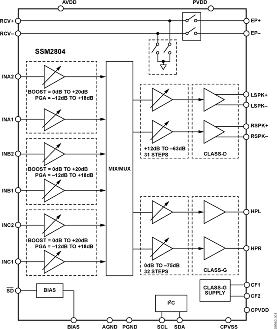 每组输入可以通过2线I2C接口独立调整,并且提供30 dB范围、1 dB步长的可调增益。每组输入通道还提供可选的可变输入阻抗PGA模式或固定输入阻抗升压模式。输入信号经过混频后路由至所需的一组输出。该配置通过2线I2C控制接口设置。