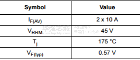 This device is a dual diode Schottky rectifier, suited to high frequency switch mode power supply.