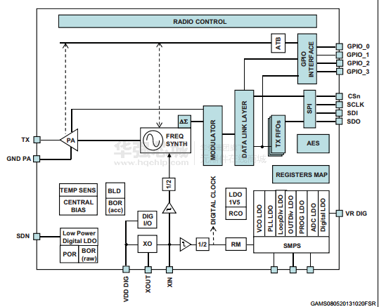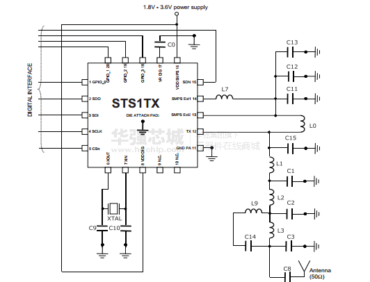 AES 128位加密协处理器可用于安全的数据传输。sts1tx支持不同的调制方案的性能,GFSK,OOK,问,和MSK。发送的数据字节缓冲FIFO(TX FIFO),可通过SPI接口的主机处理。
