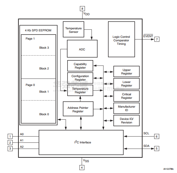 数字温度传感器组件具有用户可编程寄存器DIMM的温度传感应用提供能力。当监测温度超过了可编程限制时,该开漏事件输出引脚是活动的,或是在报警窗口上方或下方。用户可以选择将事件输出设置为一个临界温度输出。该引脚可以配置为在一个比较器模式操作或在温控器操作或中断模式。