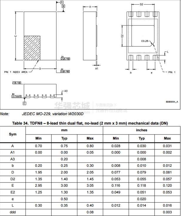 2毫米x 3毫米tdfn8,高度:0.80毫米(最大):JEDEC mo-229,w2030d符合RoHS、无卤