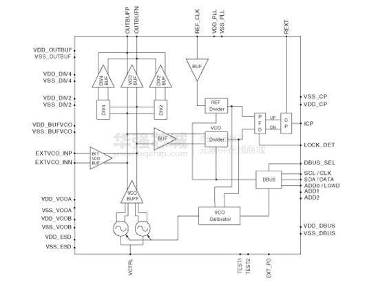 2可编程计数器来实现反馈分频比从256到65551(预分频器的16 / 17)和从361到77836(预分频器的19 / 20)。