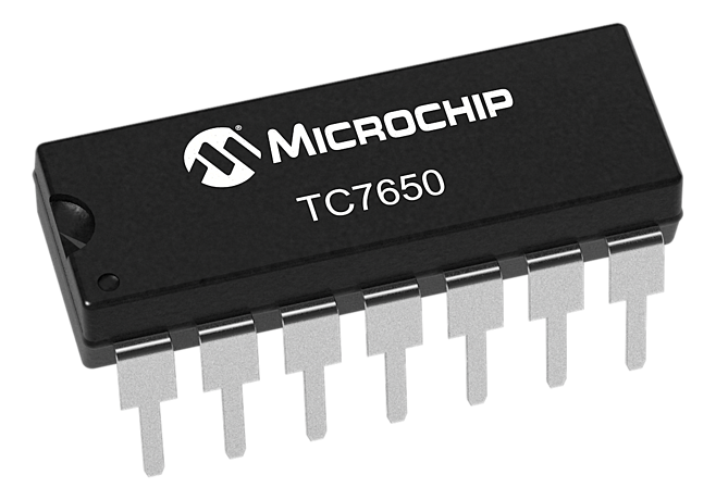 TC7650 CMOS chopper-stabilized operational amplifier practically removes offset voltage error terms from system error calculations. 5uV maximum VOS specification, for example, represents a 15 times improvement over the industry-standard OP07E. 50 nV/°C off-set drift specification is over 25 times lower than the OP07E. Increased performance eliminates VOS trim procedures, periodic potentiometer adjustment and the reliability problems caused by damaged trimmers. The TC7650 performance advantages are achieved without the additional manufacturing complexity and cost incurred with laser or "zener zap" VOS trim techniques. The TC7650 nulling scheme corrects both DC VOS errors and VOS drift errors with temperature. A nulling amplifier alternately corrects its own VOS errors and the main amplifier VOS error. Offset nulling voltages are stored on two user-supplied external capacitors. The capacitors connect to the internal amplifier VOS null points. The main amplifier input signal is never switched. Switching spikes are not present at the TC7650 output. The 14-pin dual-in-line package (DIP) has an external oscillator input to drive the nulling circuitry for optimum noise performance. Both the 8 and 14-pin DIPs have an output voltage clamp circuit to minimize overload recovery time.