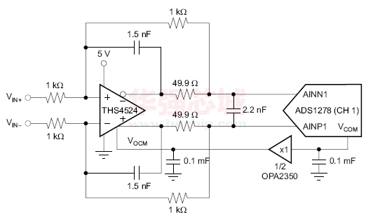 这个完全差分运算放大器特有精准的输出共模控制,此控制可在驱动模数转换器 (ADC) 时实现 dc 耦合。 与一个低于负电源轨和轨到轨输出的输入共模范围相耦合,这个控制可以很容易的实现与单端、地面基准信号源对接。 除此之外,THS4524 非常适合用于驱动逐次逼近寄存器 (SAR) 和只使用一个单 +2.5V 至 +5V 和地面电源的三角积分 (ΔΣ) ADC。