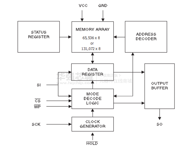整个存储器阵列( 512K )通过编程状态寄存器使能。另写使能和写提供额外的数据保护禁用指令。硬件数据保护通过WP引脚,以防止意外提供尝试写入到状态寄存器。 HOLD引脚可用于暂停任何串行无需复位串行序列沟通。