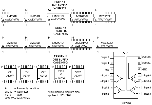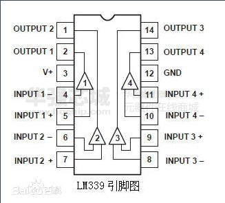 LM339集成块采用C-14型封装,外型及管脚排列如图。由于LM339使用灵活,应用广泛,所以世界上各大IC生产厂、公司竞相推出自己的四比较器,如IR2339、ANI339、SF339等,它们的参数基本一致,可互换使用。